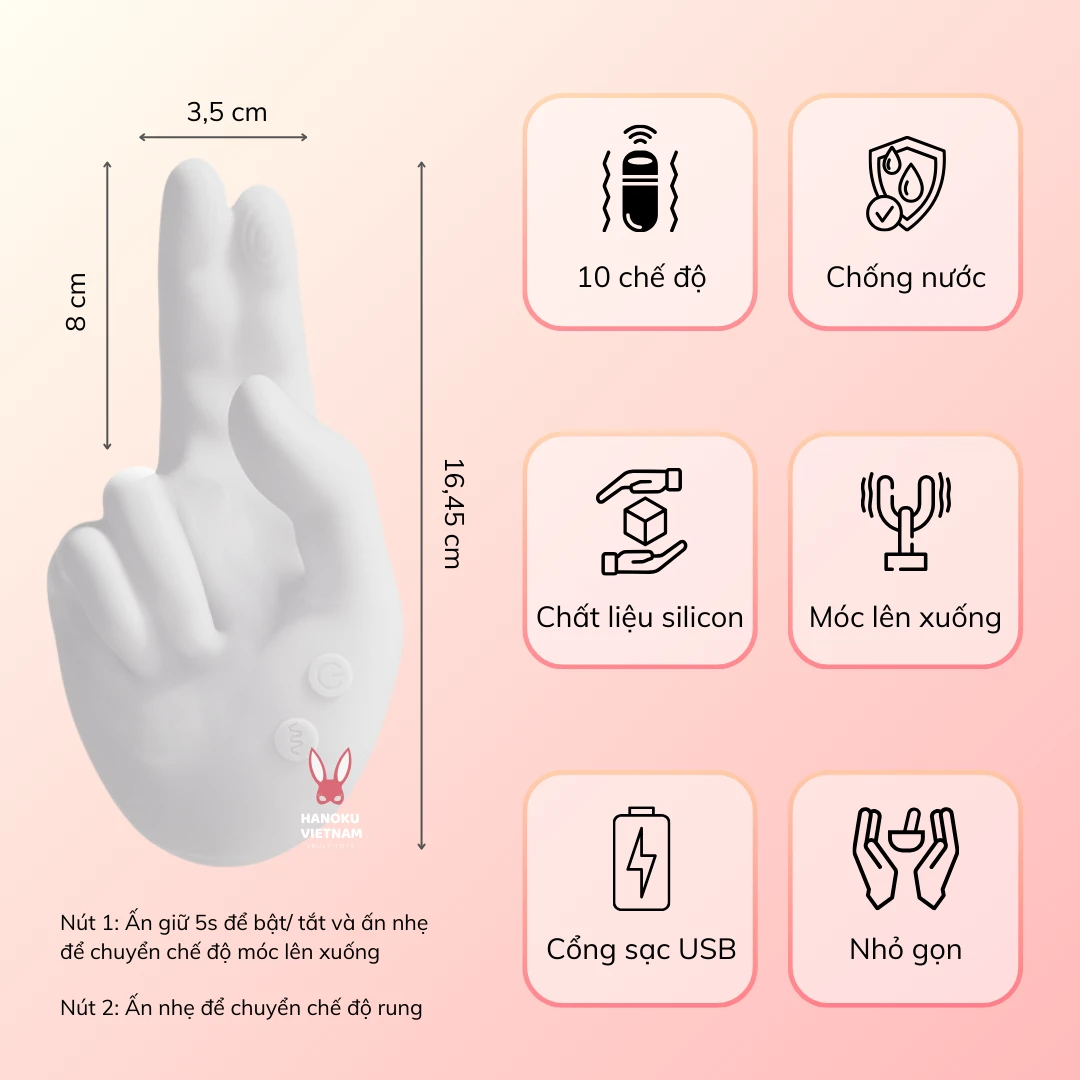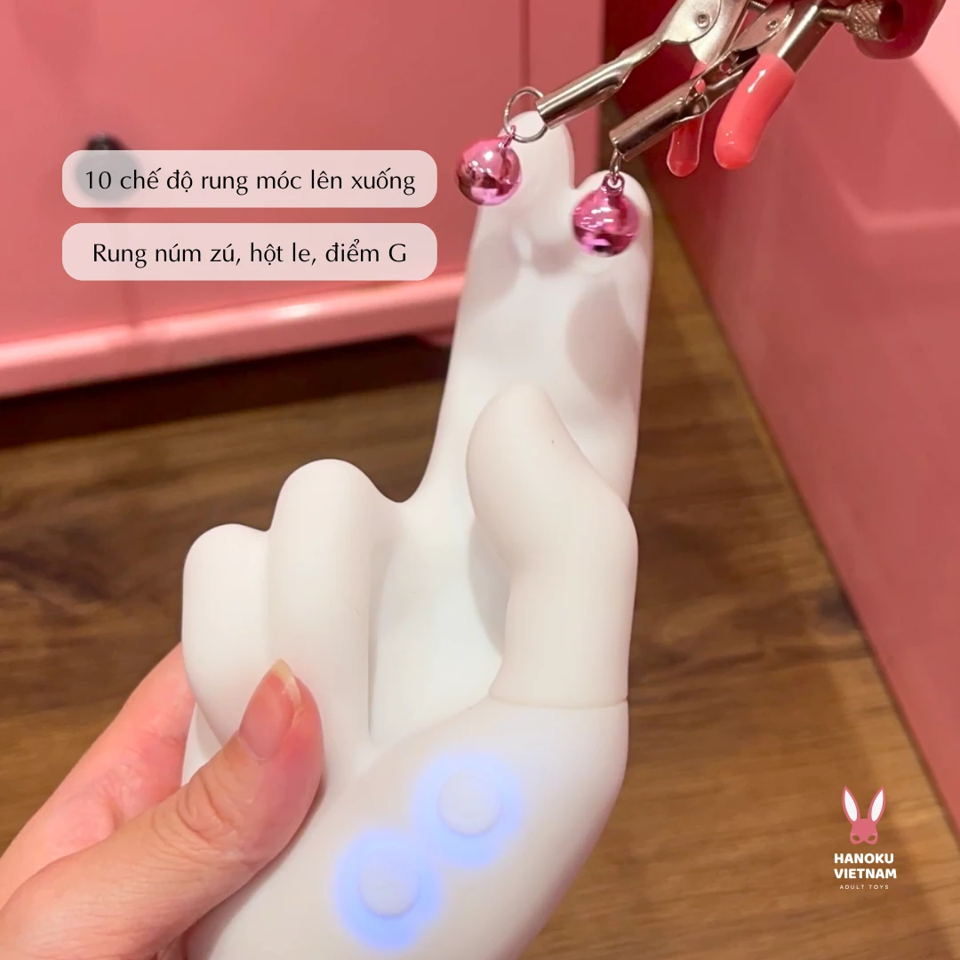 Khác biệt hoàn toàn với các sản phẩm rung thông thường, Bàn Tay Ma Thuật kết hợp đồng thời giữa vuốt ve bên ngoài bằng đầu rung ở ngón tay trỏ và thâm nhập sâu, móc rung lên xuống ở 2 ngón tay giữa. Anh chị em có thể điều chỉnh theo ý thích với 10 chế độ rung và 10 chế độ móc lên xuống.