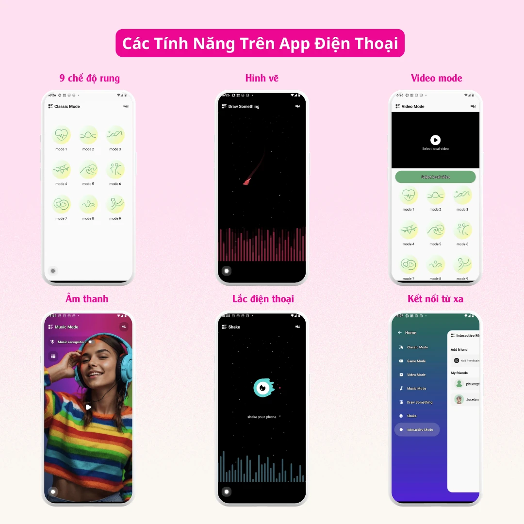 - 📲 Điều khiển từ xa qua APP thông minh – Tích hợp: rung theo nhạc yêu thích, rung theo nét vẽ tùy chỉnh, 9 chế độ mặc định đa dạng, đặc biệt: kết nối không giới hạn khoảng cách, cực hợp cho yêu xa